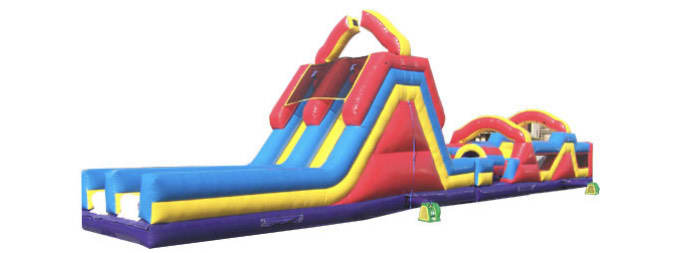 This 70 foot obstacle course has two crawl through holes so two kids can go at one time, 2 person climber, 2 person slide which is 5 feet high, inflated vertical pop ups and horizontal logs, the second slide is 10 feet high at a 45 degree angle.