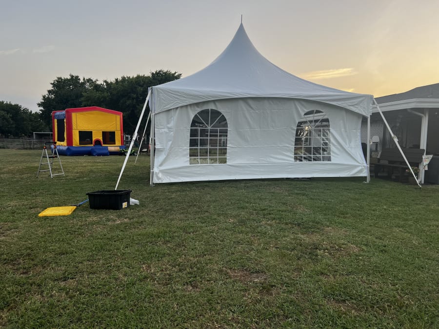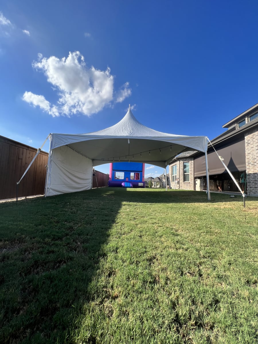This 20x20 high peak Tent its great for any Event, Birthday Party, Church event, School event. This Obstacle has good quality material. We are Located in Plano Texas but we also service Allen, McKinney, Frisco, Anna, Melissa, Celina, Murphy Luca, Prosper, Princeton, Garland, Little elm, Rowlett, Rockwall and more.